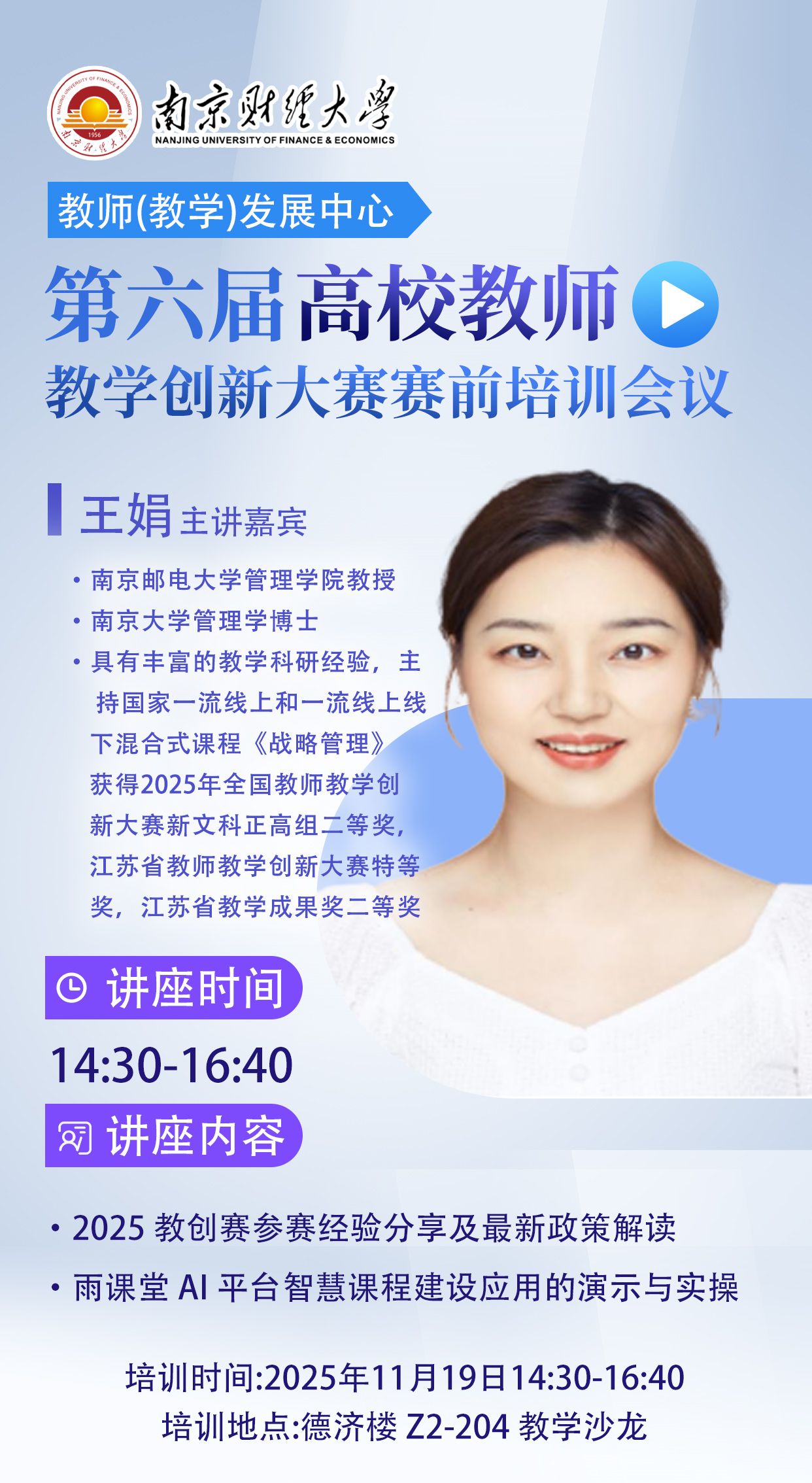 为顺利开展第六届高校教师教学创新大赛,助力我校教师深度开展生成式人工智能时代教学创新,教师(教学)发展中心特邀请专家对我校全体参赛教师进行培训,提升教学竞赛水平,具体安排如下: