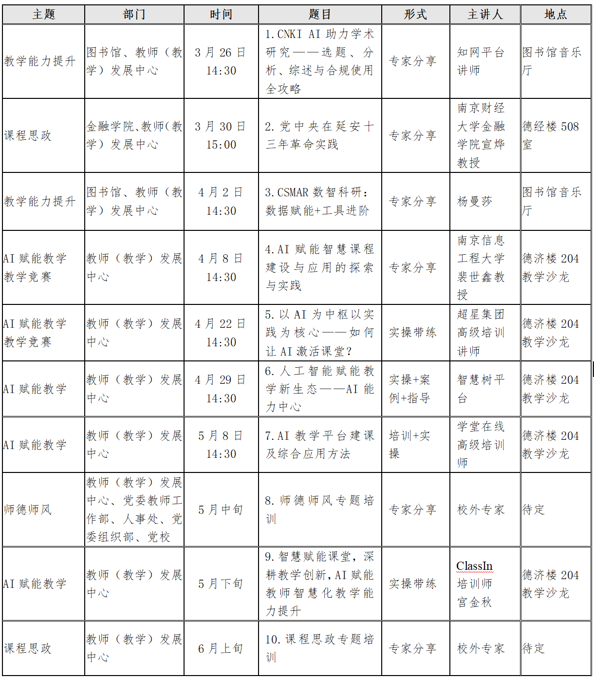 本学期培训重点围绕AI赋能教学、师德师风、课程思政、教学竞赛等主题,详见“表1”: